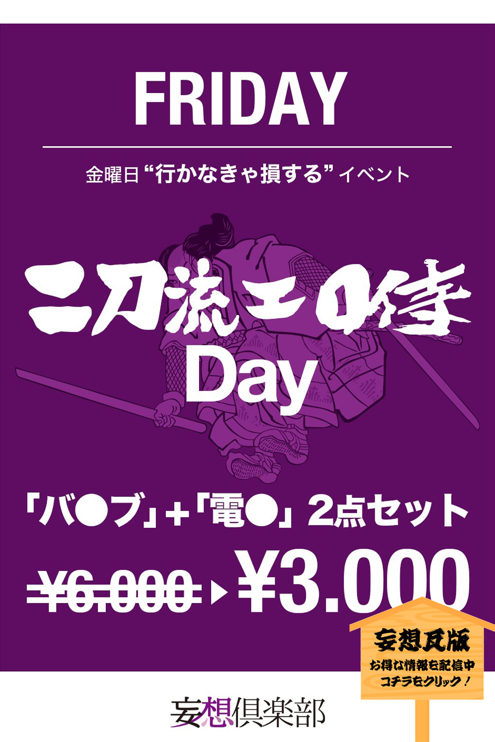 2025 10月 03日 16:40 日替わりイベント案内! 本日の日替わりイベントは… 『二刀流エロ侍』 交互に使うも良し! 同時に使うも良し! 思う存分大人のおもちゃで 女の子を責めちゃって下さい! 使い方は貴方次第! 是非ご利用下さい!