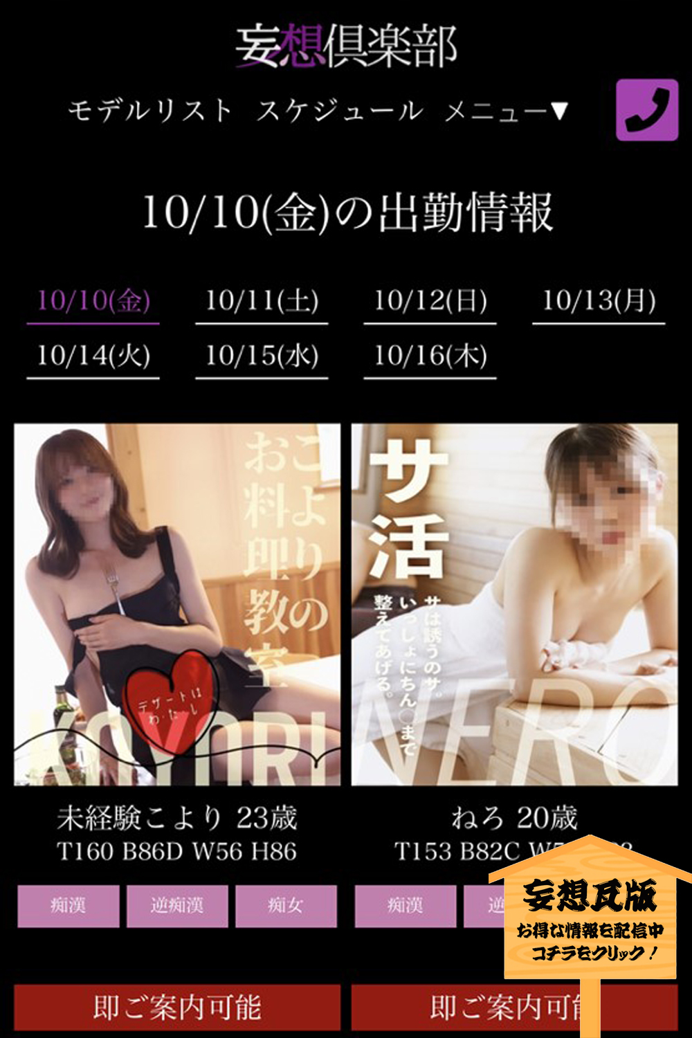 2025 10月 10日 16:56 即割 皆様、こんばんは! 10月10日(金) 妄想瓦版です! 本日17時よりラスト迄 「即割」開催です!! 出勤情報の【即ご案内可能】 の マークが付いた女の子が対象となります。 本日の出勤情報はコチラから⤵ https://www.mousouclub.jp/schedule.html ご予約、ご来店時の前には 是非、ご確認ください。 ※30分以内にご来店頂けるお客様が対象となります。 皆様のご来店をお待ちしております!!