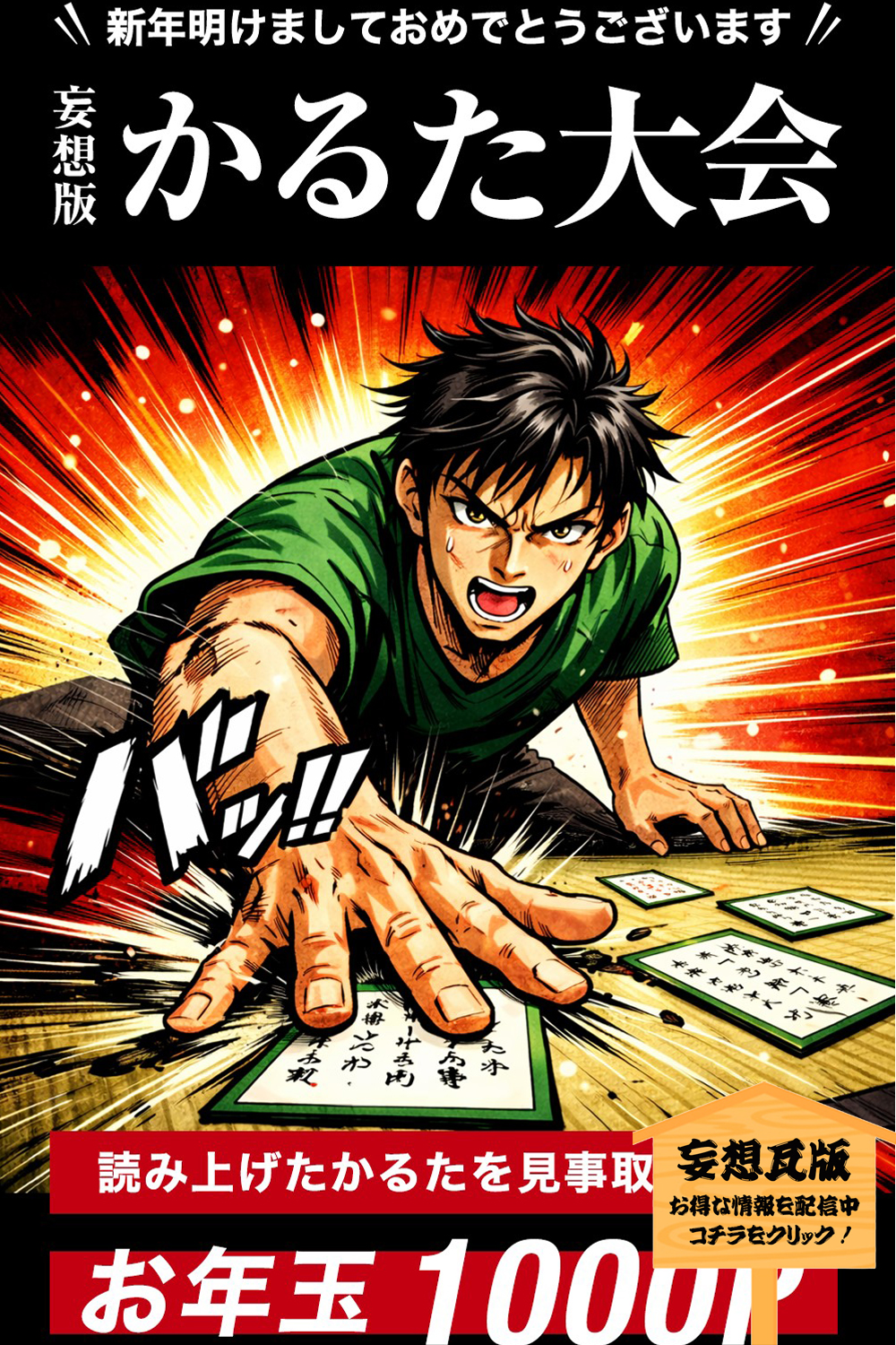 2026 1月 02日 19:00 イベント紹介 1月2日㈮ 妄想俱楽部瓦版です。 皆様、明けましておめでとうございます。 昨年中は格別のご愛顧を賜り厚くお礼申し上げます。 今年もコチラの瓦版にてお得な情報を発信してまいります。 皆様、本年も宜しくお願い致します。 それでは本日は今月のイベント紹介!! 2026年! 妄想俱楽部新春かるた大会! スタッフが読み上げた 「かるた(図柄)」を取れば!! 1000ポイントGET!! 是非、この機会にポイントを貯めて下さい。
