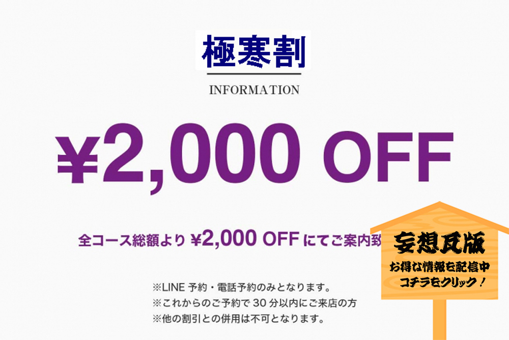 2026 2月 08日 17:32 ⛄🥶 皆様こんばんは。 2月8日(日) 妄想俱楽部瓦版です。 久しぶりのまとまった雪でしたね。 今現在は止み、 このあと雪の降る心配はなさそうですが、、、、 🥶 寒いですね!! そんな本日、 このあと妄想俱楽部にご来店頂ける皆様へ 【極寒割】開催です。 本日ラスト迄ご利用可能ですので、 会員様はもちろんご新規様も 是非、ご利用ください!! ご来店時は暖かくしてご来店ください!!